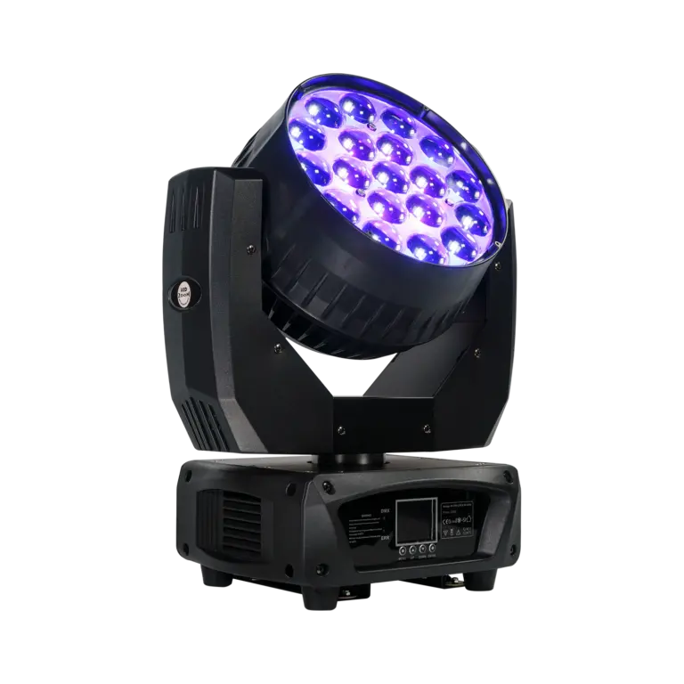 C19 is a high brightness LED moving head wash light powered by 19pcs and 15Watt LED chip. RGBW even color mixing. Motorized zoom range 8° – 50°. With DMX, Master-slave, Sound, Auto control available.